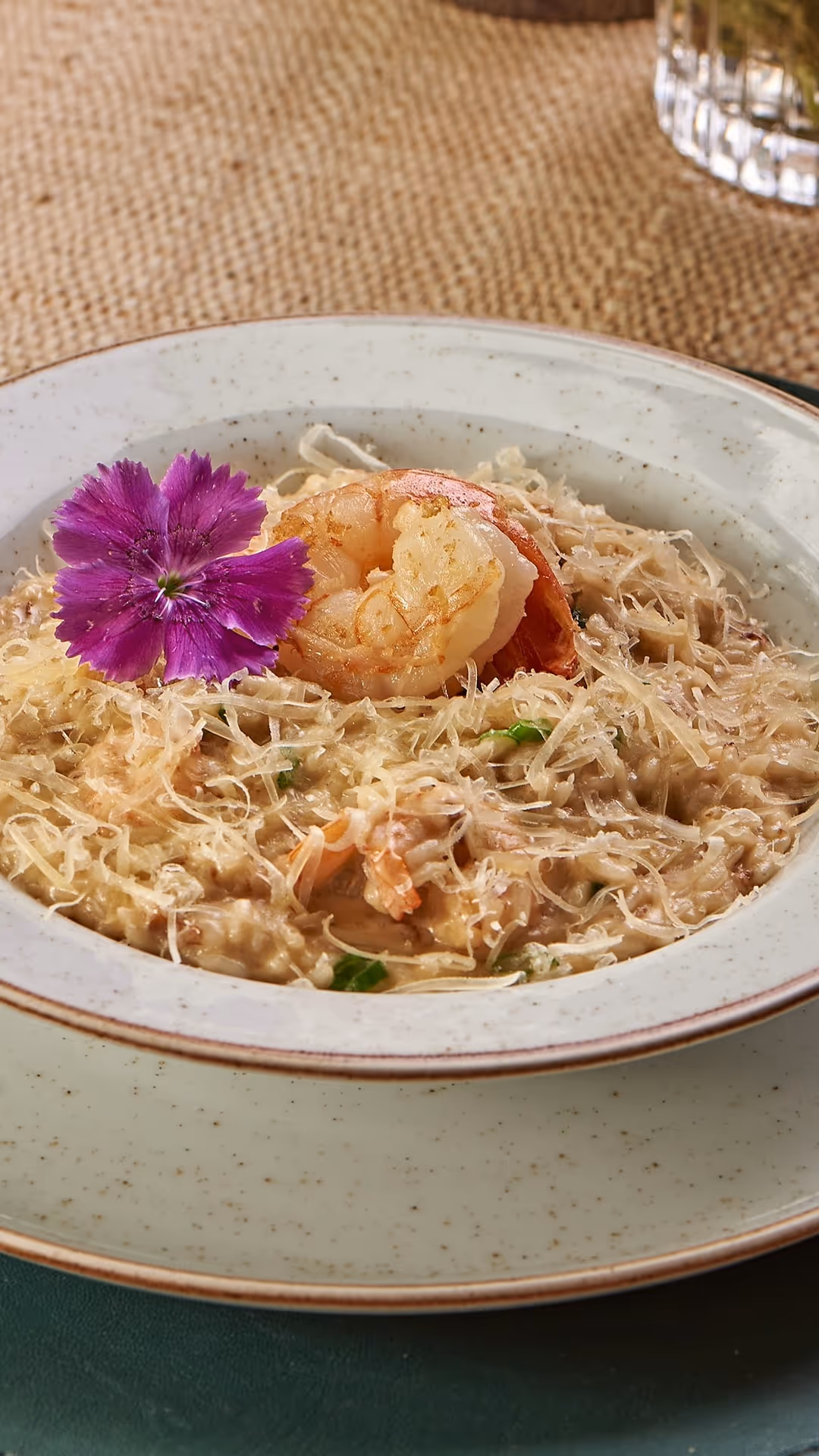 Arroz carnaroli, camarão salteado na manteiga, camarão borboleta grelhado e parmesão.
