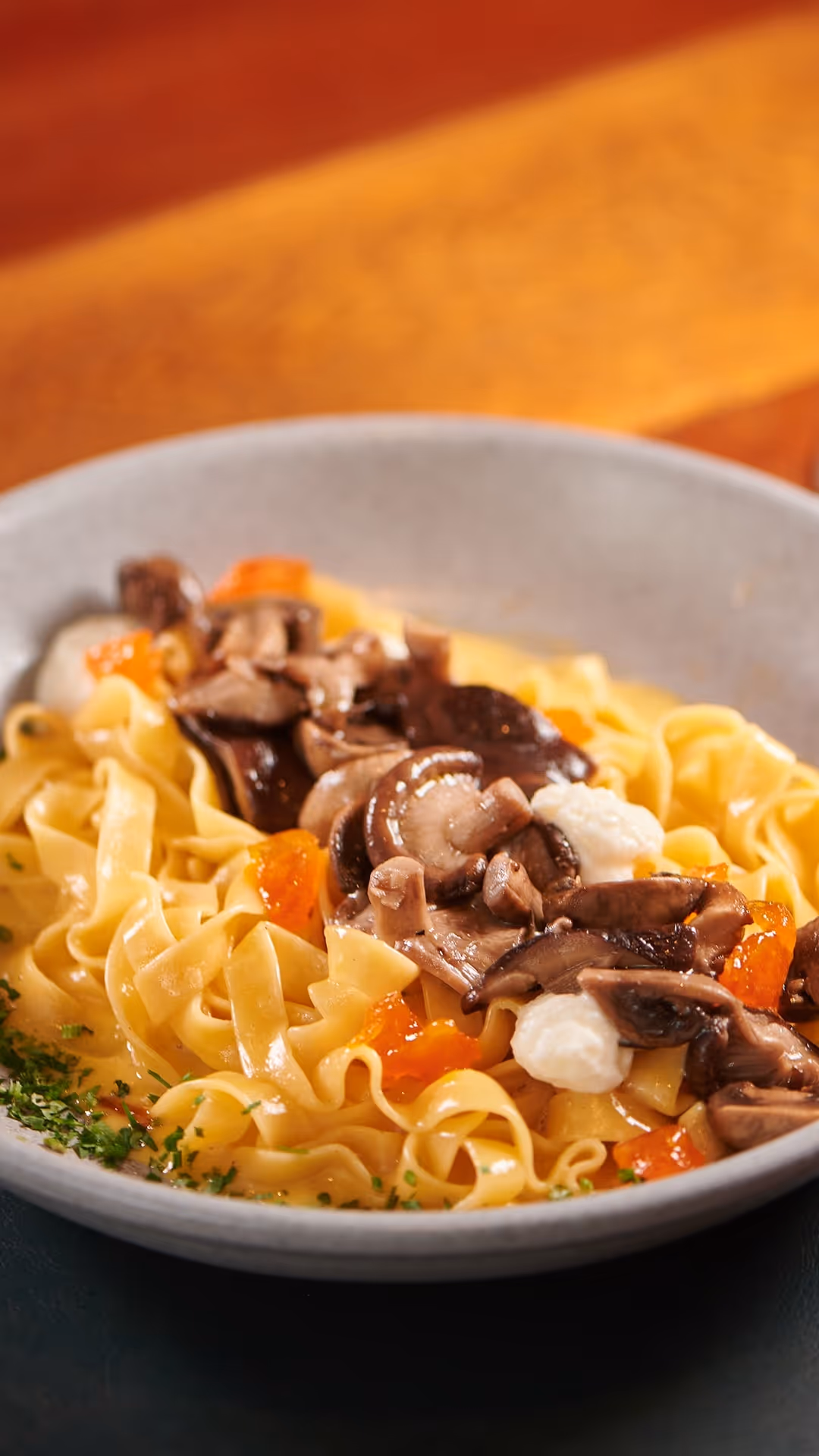 Tagliatelle com creme de ovo caipira e vinho branco, cogumelos shitake e paris assados e trufados, finalizado com stracciatella e gema ovo curado.