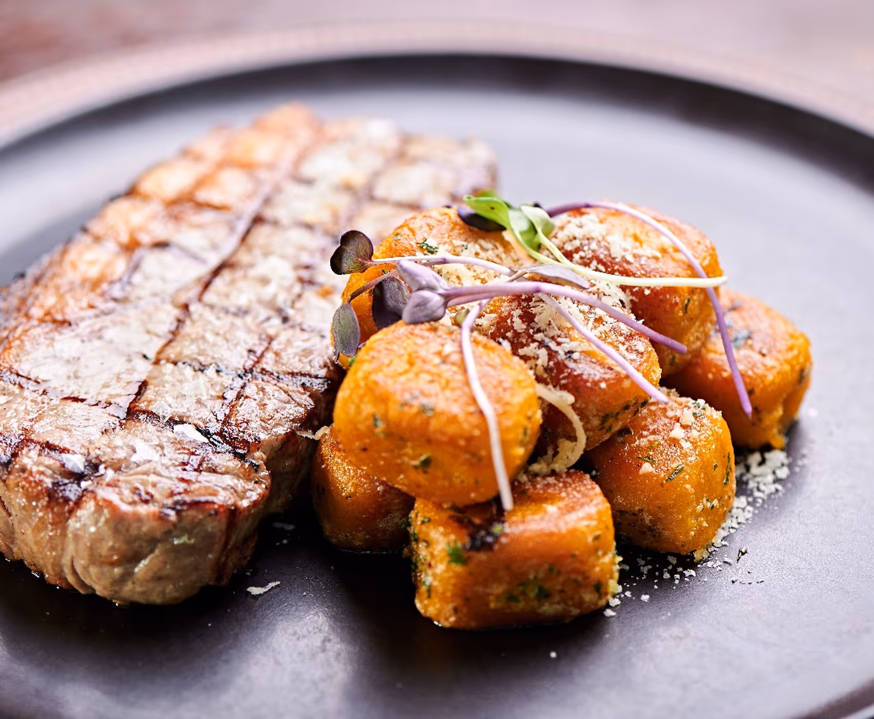 Corte extremamente macio, angus, grelhado em chama aberta, finalizado com sal maldon, acompanhado de gnocchi de cabotiá grelhado na manteiga de ervas.