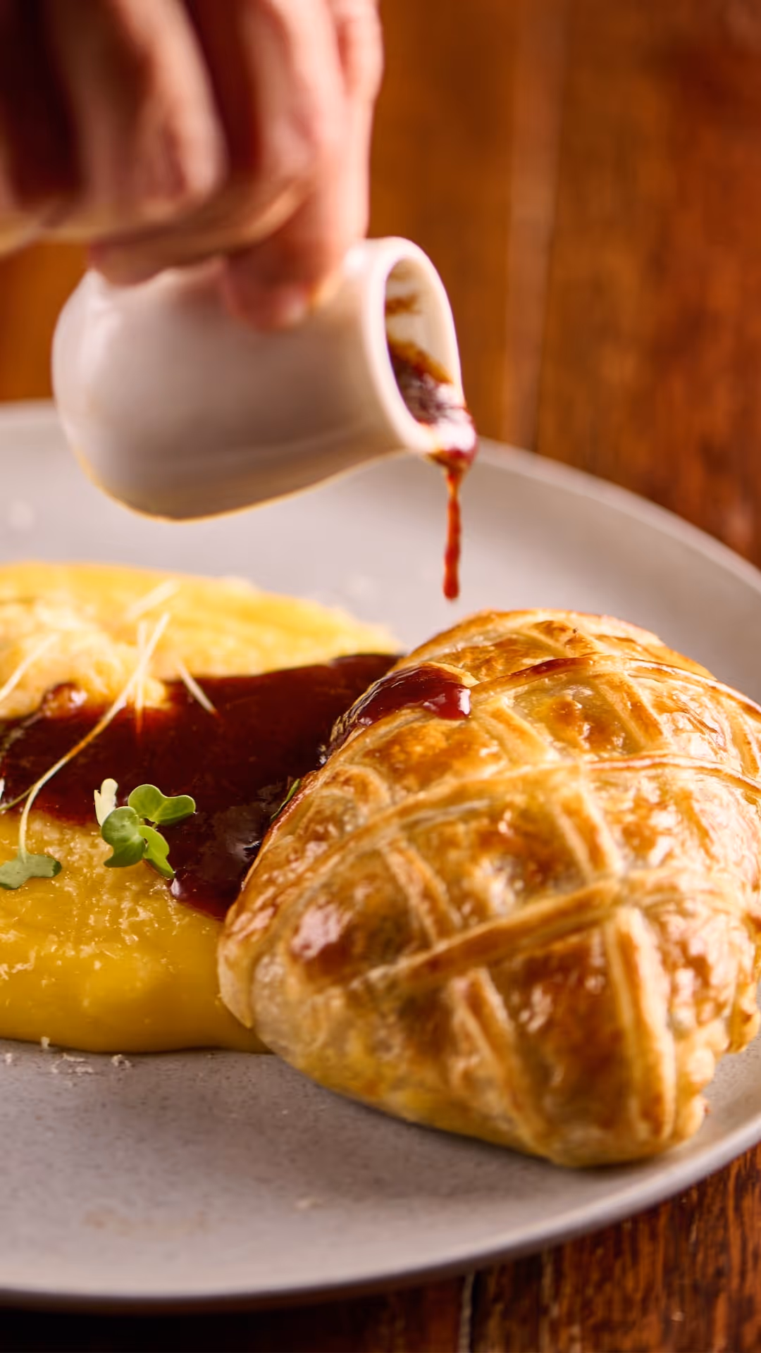 Corte alto e suculento de filé mignon, envolto em uma camada de druxelles de cogumelos, presunto parma e massa foleada, servido com mousseline de mandioquinha e demi-glace.