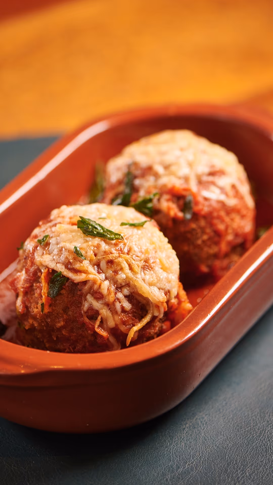 Polpeta Bovina frita, recheado com queijo (meia cura e muçarela), massa fresca no molho pesto, finalizado ao molho pomodoro